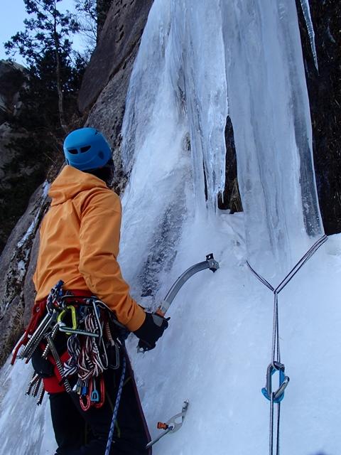 中俣は、気温が高い日が続き、当日も比較的高かったので氷結具合を心配していましたが、途切れることなく氷は続いていました。ただ、全体的に氷は薄く、また空洞の多い状態だったのでスクリューを打つのに気をつかいますし、ライン取りもタイトになります。