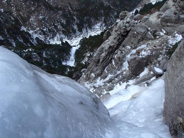 3mほどのバーティカルを含む40m。下からは傾斜がないように見える部分も意外と嫌らしい。途中、足が完全に抜けて片手だけになってしまいました。ヘタクソなものです。スクリューを打てない薄い箇所を避けながらラインを取り、顕著なテラスでピッチを切りました。ボルトも残置物もないのでスクリューをアンカーにしようと打ち込んだら、なんと氷がスカスカ。最終的には太いツララにスリングを巻いて終了点を作ったのですが、ビレイ中は生きた心地がしませんでした。パートナーが落ちないよう祈るのみ。