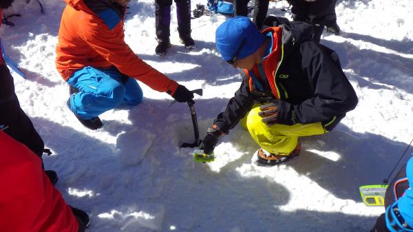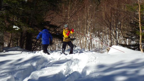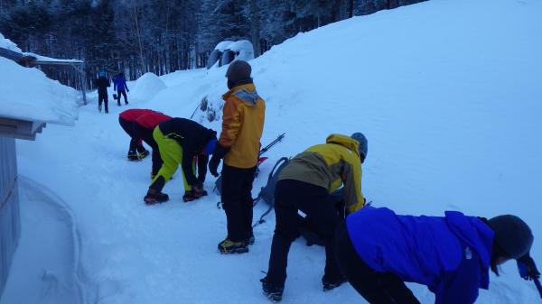 研修内容はアイゼンワーク、ラッセルからビーコンを使った捜索方法の練習まで、雪山で必要になる道具の使用方法について学んできました。実際に使ってみることで、お店で道具をいじっているだけではわからないことも見えてきたので、いい経験になりました。