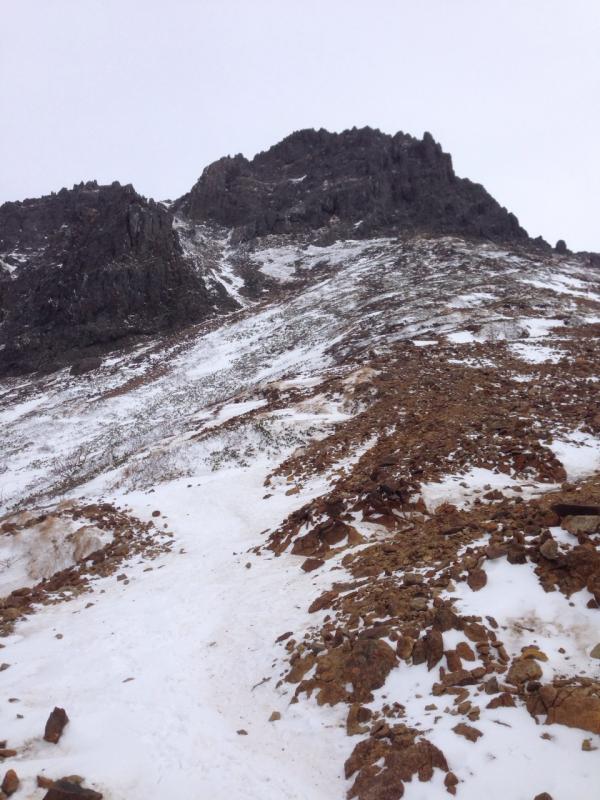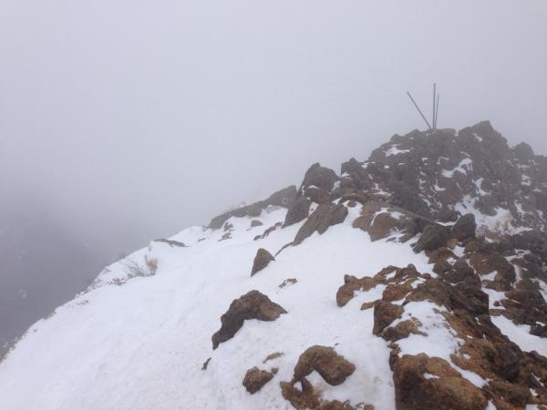雪が割と少なめだったので山頂直下は岩も露出していてアイゼンを付けての登りはこれまた苦労しましたが、