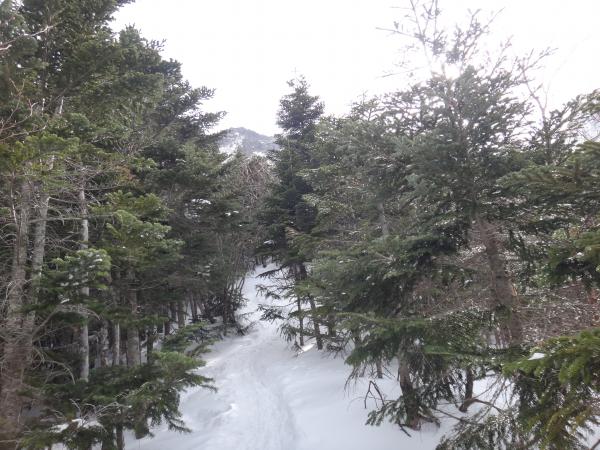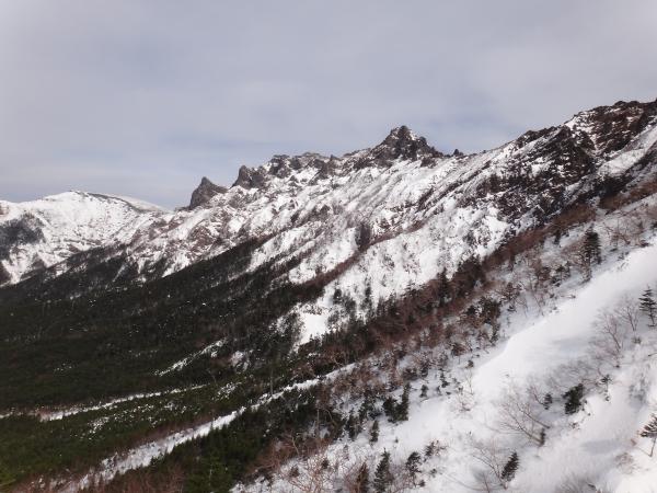 - 行者小屋までの林道は一週間前よりも雪が減り土が露出している部分もありました。文三郎尾根は急傾斜、登りはアイゼンとピッケルをしっかり利かせて一歩一歩登りました。