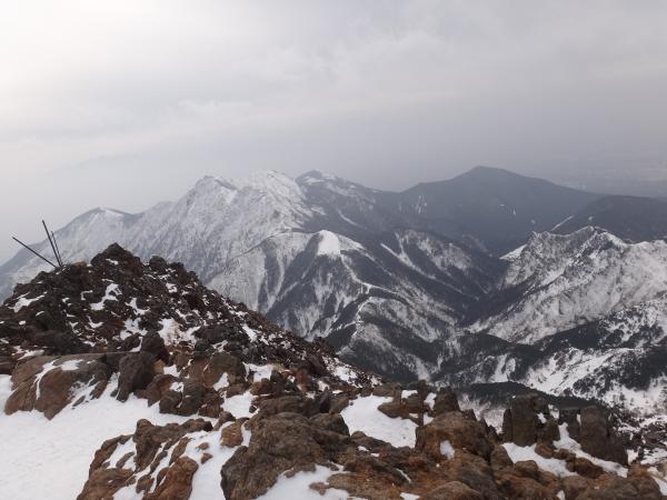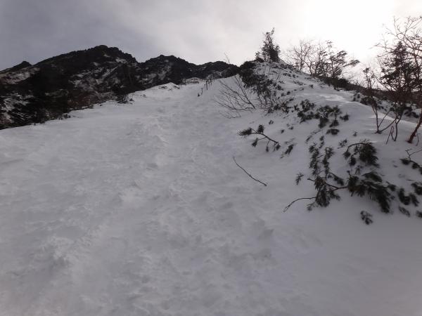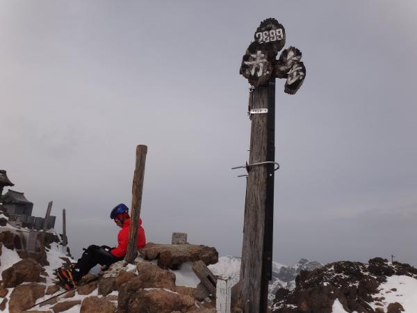 雪が少ないとはいえ、山頂直下は強風、岩も出てくるのでキックステップと三点支持で気が抜けません。