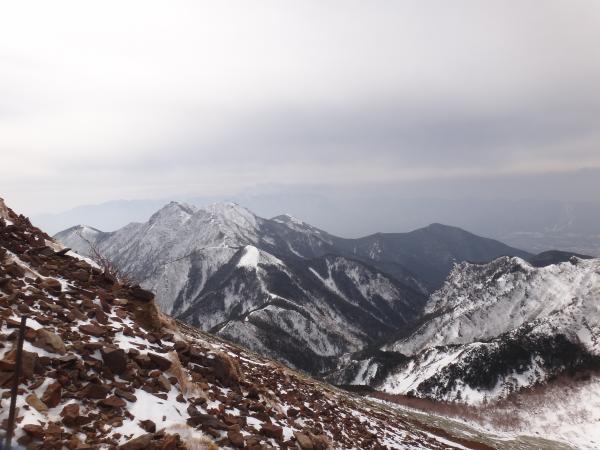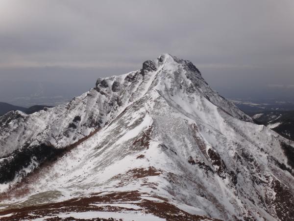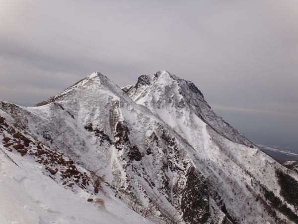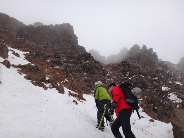梯子や切れ落ちた狭い岩場など難所を一つ一つ慎重にクリアし遂に山頂に出ました。しかし強風と共に雪も散らついてきたので、登頂の喜びを噛みしめる暇も無く早々に下山を強いられます。登り以上に神経を使いながら何とか下りましたが、冬山の怖さのほんの一端を垣間見た気がしました。