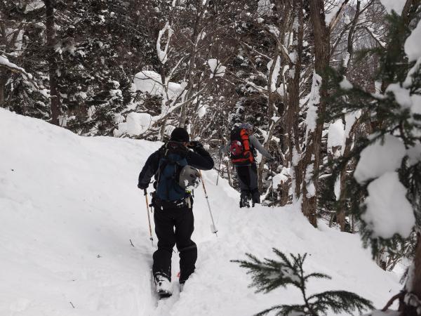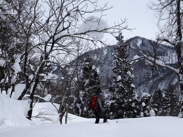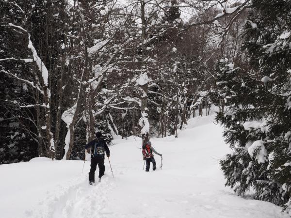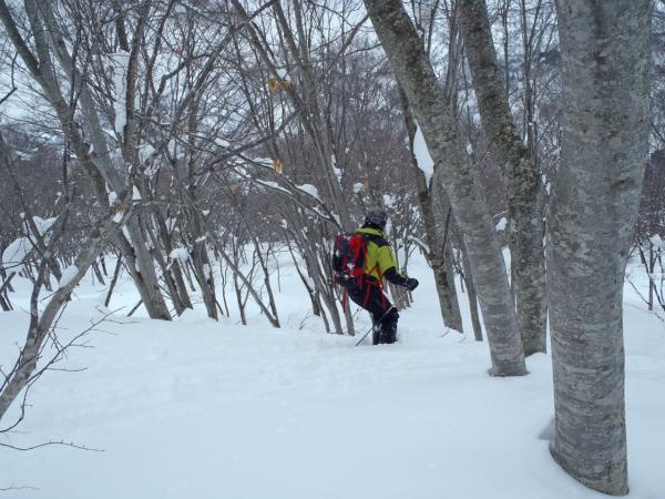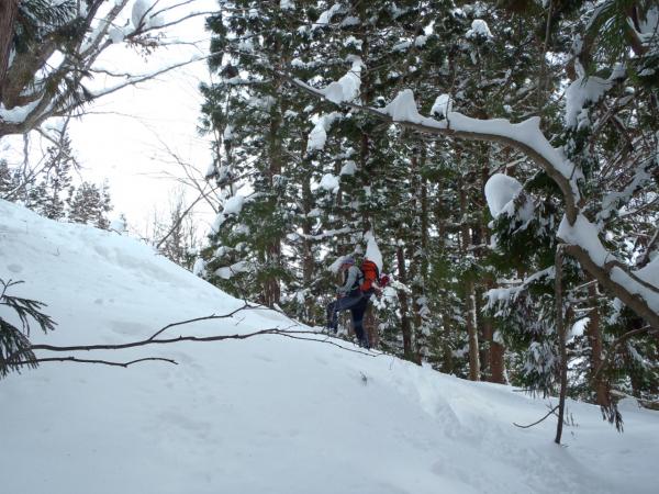 ブナ林をしばらくラッセルで登ると、新しくしっかりとしたとレースが現れ、トレースに乗り高度を稼ぐ。