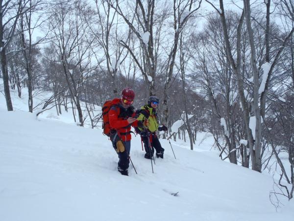 ツリーランで滑り下るも、当初の滑走ルートではないため、GPSで現在地を確認しながらなの滑走では時間がかかる。