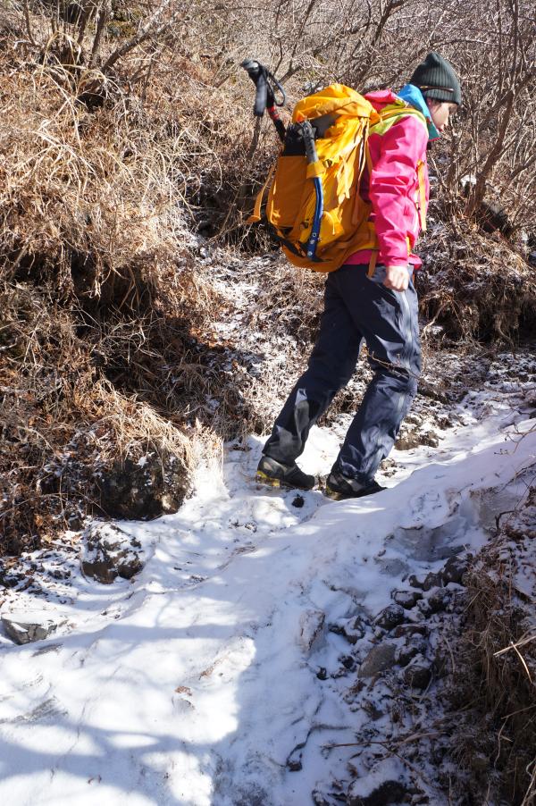 ・段原~大船山山頂……アイゼン必須。凍結が硬かったり、斜度がある道もあるので、冬用の10~12本爪だと安心です。
