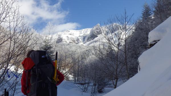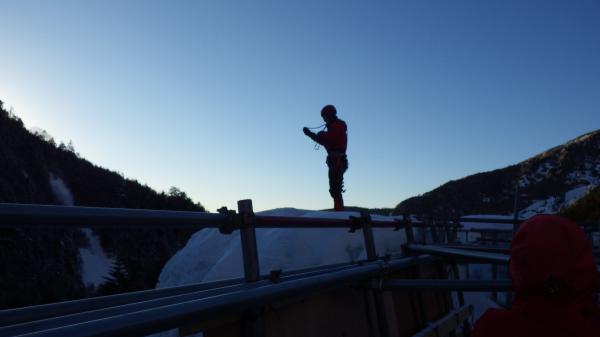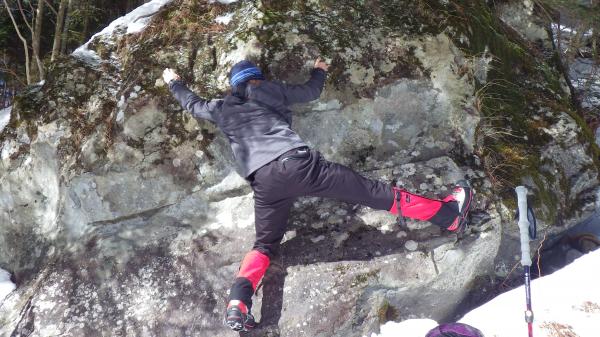 地蔵尾根は階段を下った後、シリセードを使ったりしながら下山。樹林帯は雪が固すぎず、滑るのにはちょうどよさそうでした。