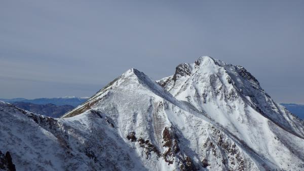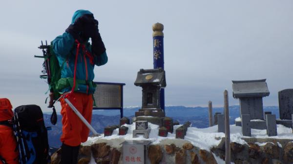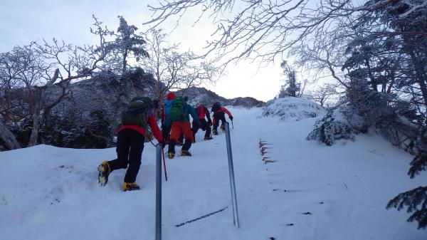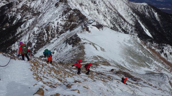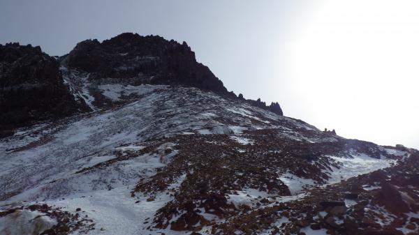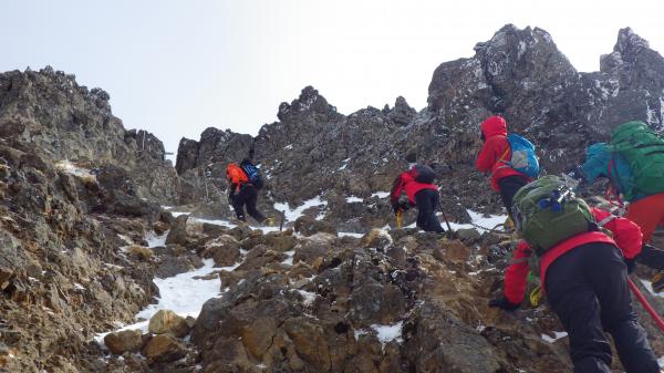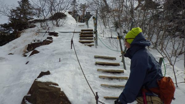 登りきって中岳との分岐に出ると、風が強くなります。そのせいか地面が見えているところも多いようでした。そのかわり、雪も締まっていて、山頂直下は凍っているところもありました。