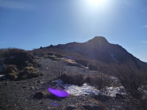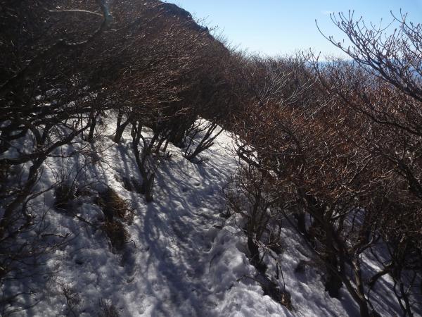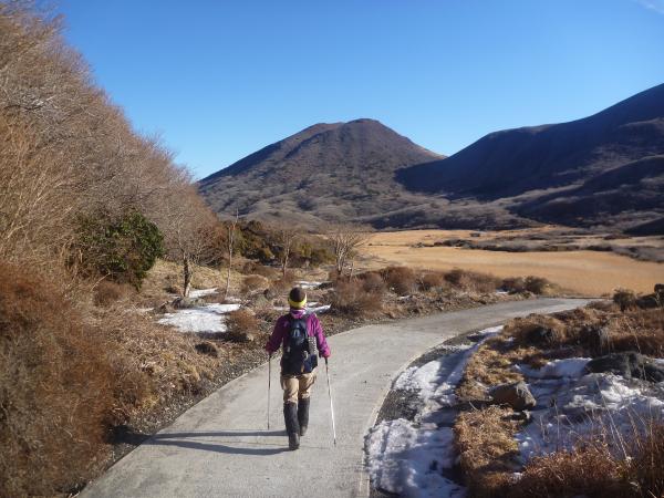 “坊ガツル”には雪がなく、“大船山登山口”から6本爪を装着。午前中ということもあり日が当たらない出だしは道がカチコチ。登ること40分程で“五合目”に到着。景色が良く、三俣山が目の前に広がる。さらに約25分で“段原”に着く。ここには雪がなくほとんど地面が露出している。また、道が細くなると雪道になる。避難小屋を通過し、急な岩場を登り切ると「大船山山頂」に到着する。