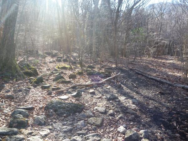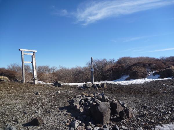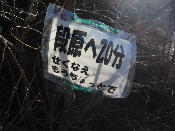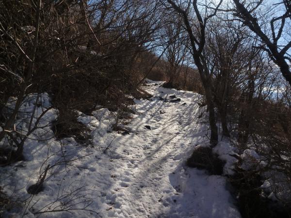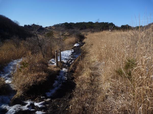 “登山口”に戻り、ここで6本爪を外す。談話室にデポした荷物を回収し、“長者原”に向かう。分岐からまた雪道になる。緩んではいるので6本爪を着けずに進む。日が当たる所は土が見えているが、ぬかるみ状態。それを繰り返し、“雨ケ池峠”に着く。ここからは下りが続くが、下るほどに雪が無くなってくる。分岐を過ぎ、20分ほど下ると登山口に着く。マットで足裏をゴシゴシしてから、長者原駐車場に向かう。