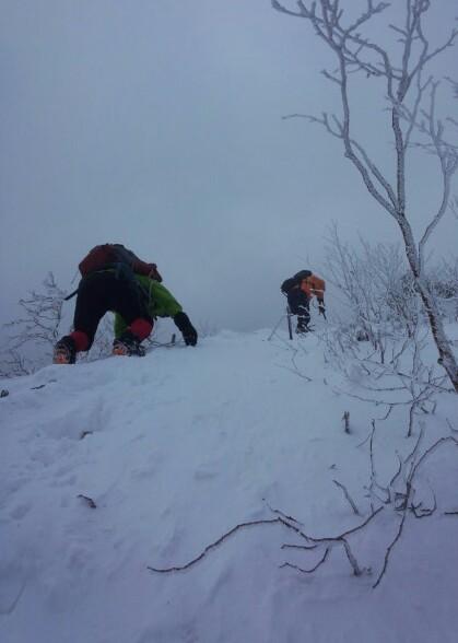 森林限界を超え、稜線歩きとなると突風へと変わりトレースも少なくなり厳しい環境になります。