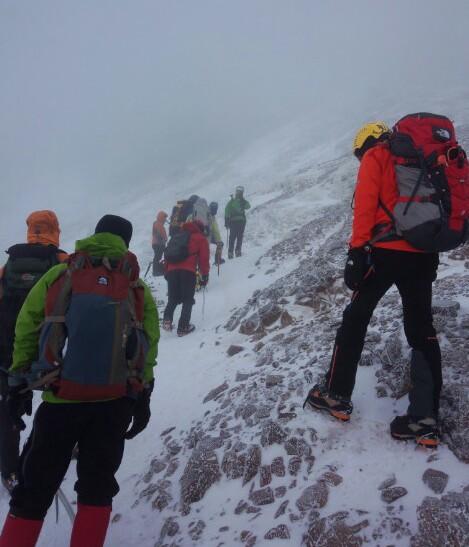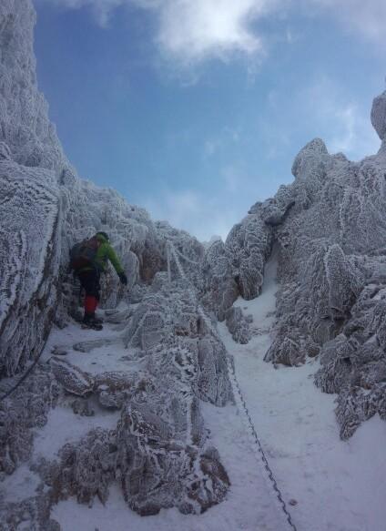 赤岳では岩場や急登の場面も増え、アイゼン、ピッケルは必要となります。南沢ルートは所々アイスバーンになっており、滑りやすい個所があります。