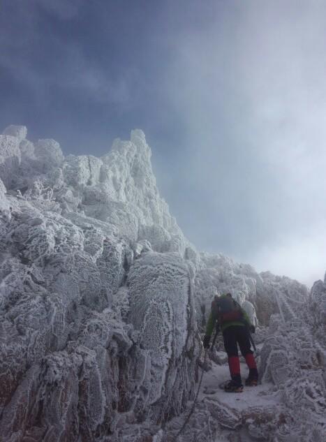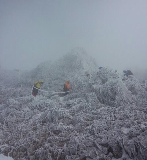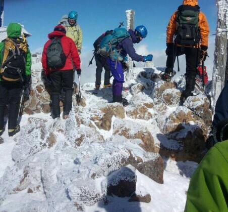 2日目赤岳。大荒れの予報のはずが、朝から太陽が!行者小屋まで来たところで少しずつ曇りへと。文三郎分岐までは急登となりますが、トレースはしっかりと付いていて、とても登り易かった。ただ、滑落の恐れはある為、細心の注意は必要です。分岐から赤岳山頂まで岩場が続きます。アイゼン、ピッケルを使い慎重に歩いていると、太陽が顔を出してくれました!山頂に着くころには遠くの山々を展望できる位清々しい青空へと変わっていました。