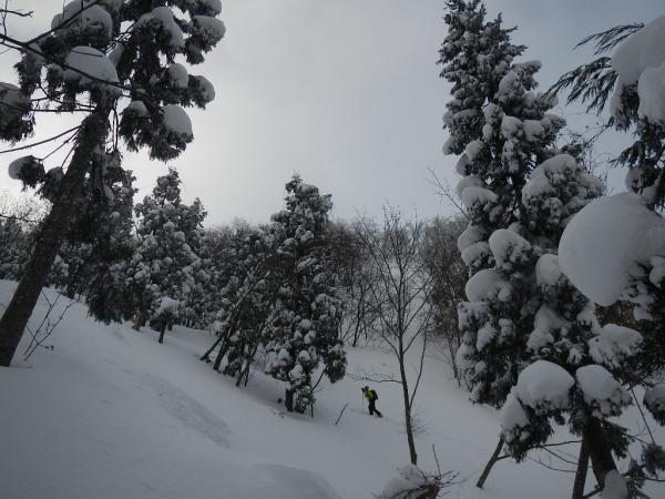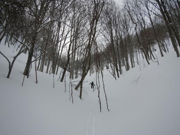 谷幅が狭く、障害物(木やブッシュ)もそれなりにあるので、どんな滑りになるか若干の不安を感じながら・・・
