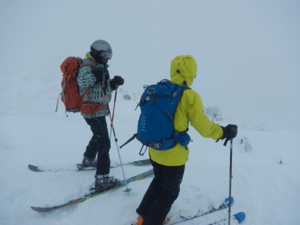 稜線が近づくと固いバーンの上にうっすらと雪が積もった状態の所がでてきたのでクトーをつけて登行。