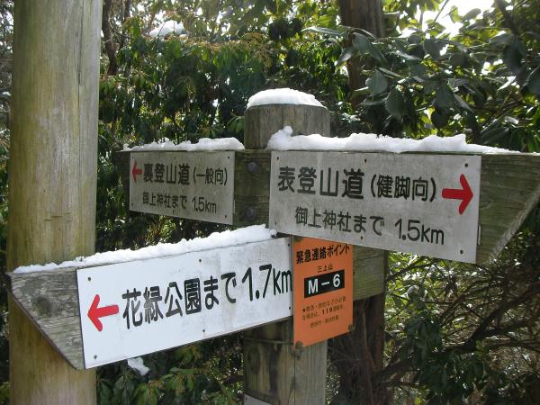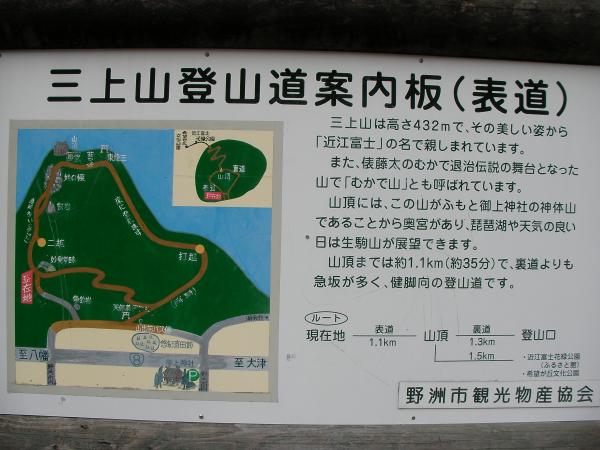 - 御神神社駐車場(10分)表登山道登山口(15分)妙見堂跡(45分)三上山山頂(20分)打越(20分)御神神社駐車場