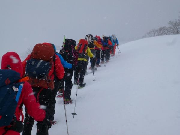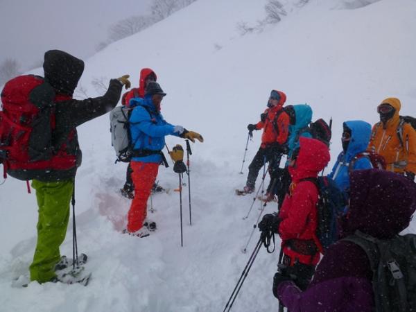 二日目は実際の山に入り、地形、気象、積雪評価と、ヒューマンファクターを総合してのルートファインディングの実践。