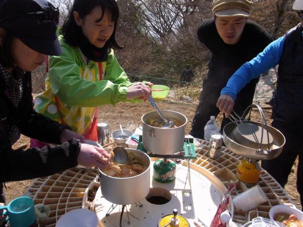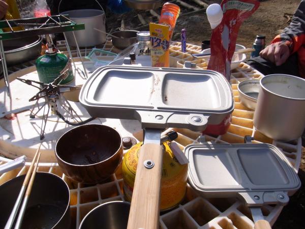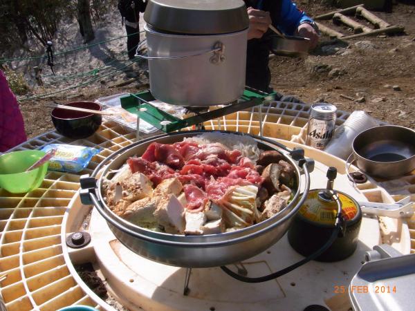 今回のメインである昼食のメニューは、チゲ鍋、スキヤキ、ホットサンド(ハムチーズ、アンバタ)、焼きししゃもと盛り沢山で、充実したパーティーができました。