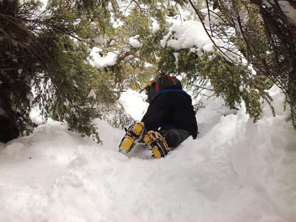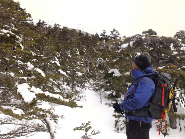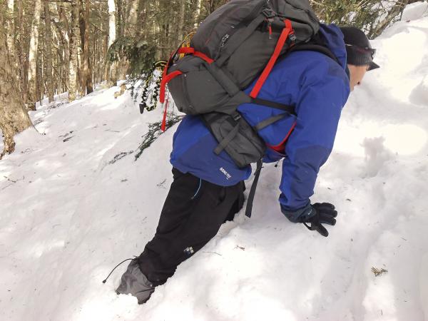 森林限界付近では、雪が深く腹ばいになって登る場所もあります。