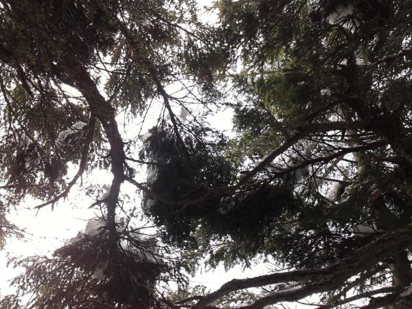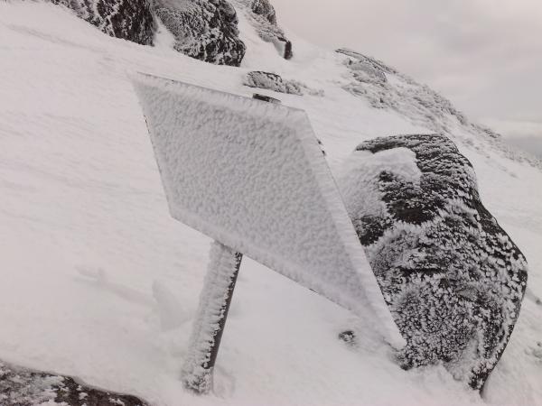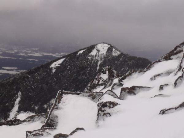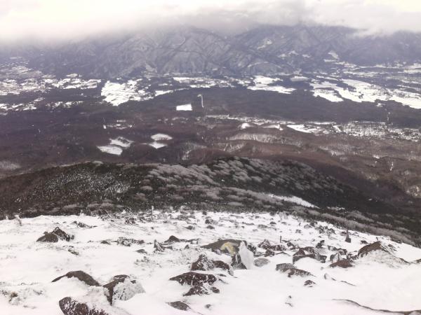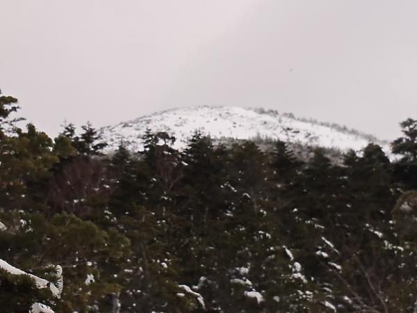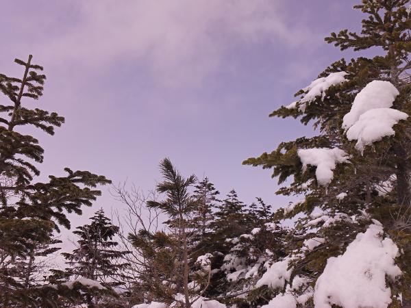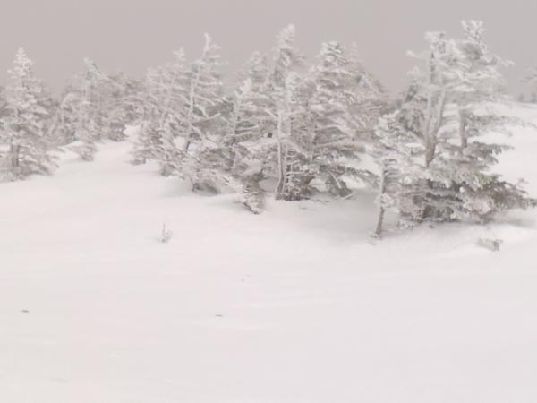森林限界付近は木の下をほふく前進、それ以降新雪でトレースはなくペンキマークのみ。