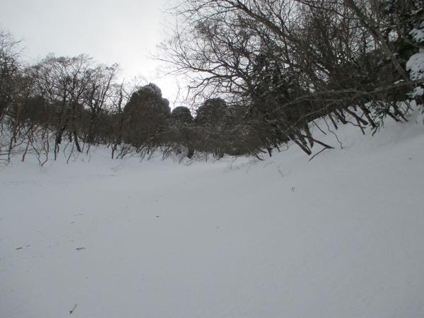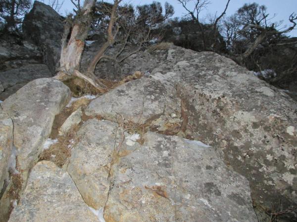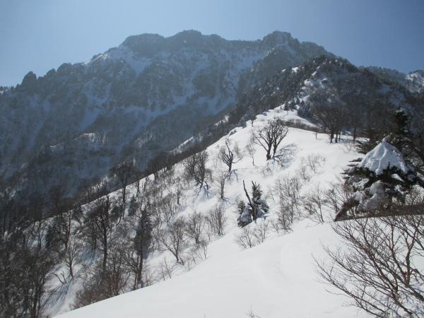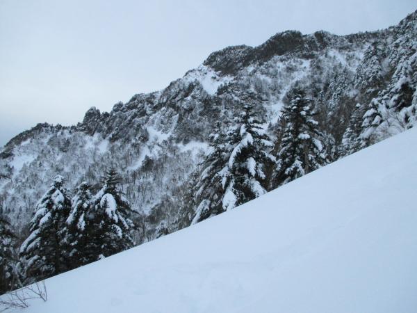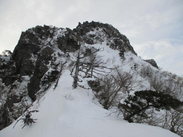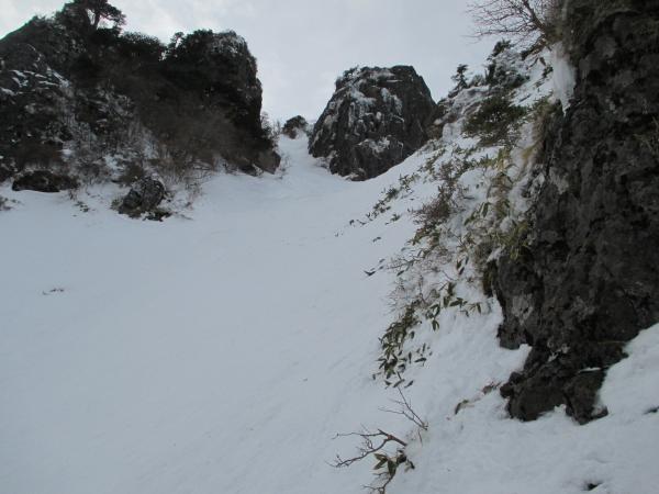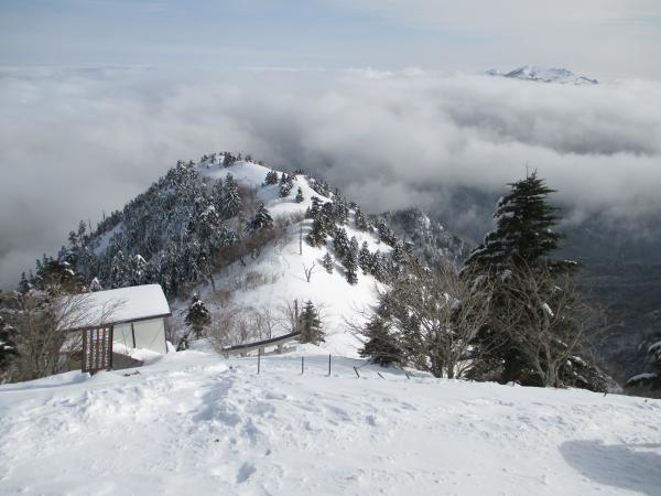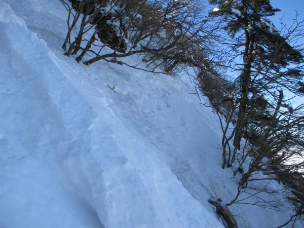 - 今年は例年に比べ、雪が多いようです。頂上直下の登山道も雪に埋もれ、谷側は切れ落ちているので、滑落しないよう注意が必要です。東稜ルートは登山者が少ないため、二ノ鎖から先のトレースは期待できません。また、二ノ鎖から矢筈岩にかけてのトラバースは3箇所ほど谷筋を通るため、雪崩や落石に注意が必要です(今回小さな雪崩跡が見られました)。東稜に入ってからは雪の急斜面や岩稜帯を通るため、ピッケル、10本あるいは12本爪アイゼンが必要です。また、ロープも持っておいた方が良いと思います。