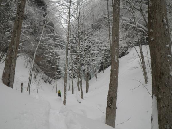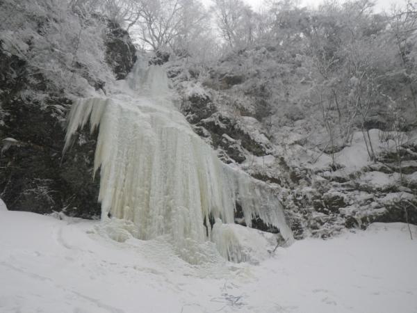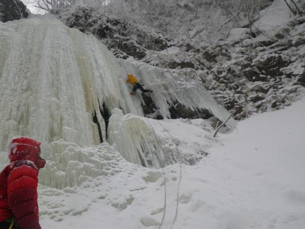 今日トライしたのは右岸の上流のゲレンデで、高低差約20mくらい、滝幅10mくらいの滝。