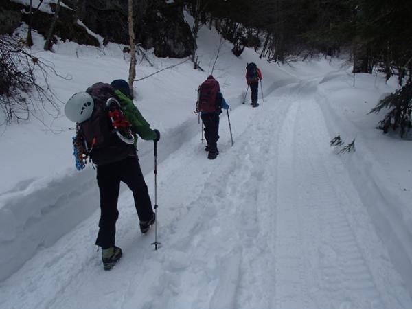 - 例年より降雪が多いせいか、林道の雪は多め。2日目の気温が高かったので、雪が緩くなり、雪団子が付きやすい。