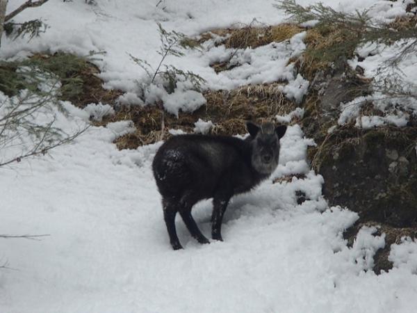 最後に、赤岳山荘へ下山中に登山道真横でカモシカに遭遇しました。
