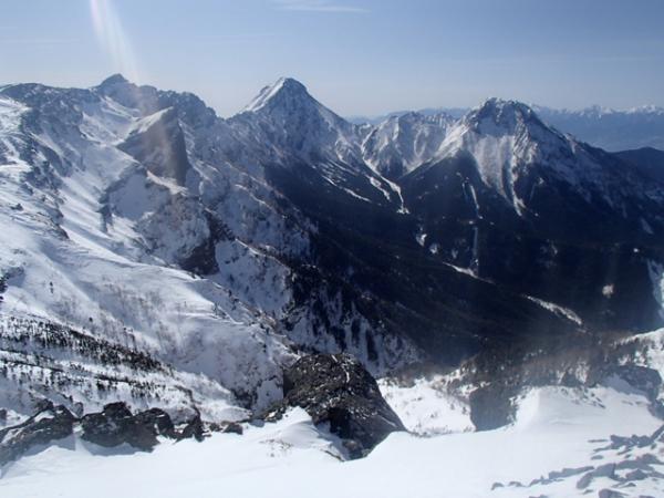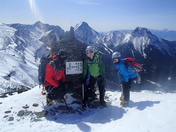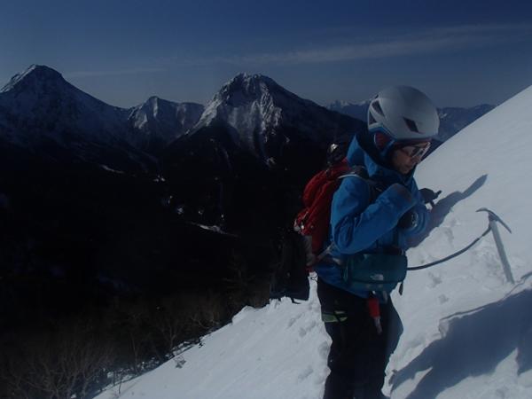 気温が高かったせいか日向の雪は緩く、赤岩の頭直下の雪が崩れやすそうだったので、慎重にトラバースしました。