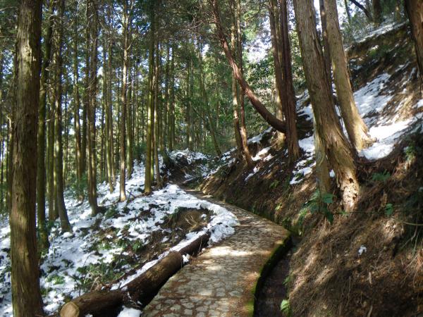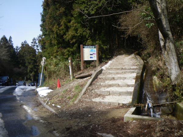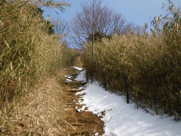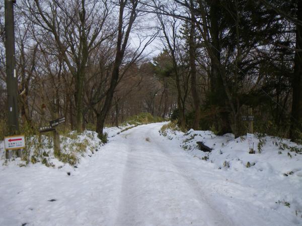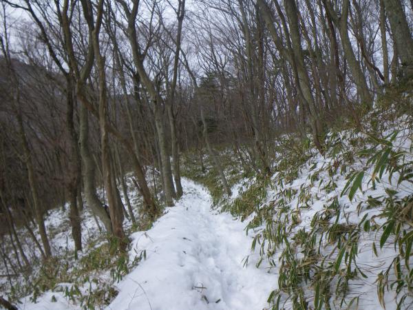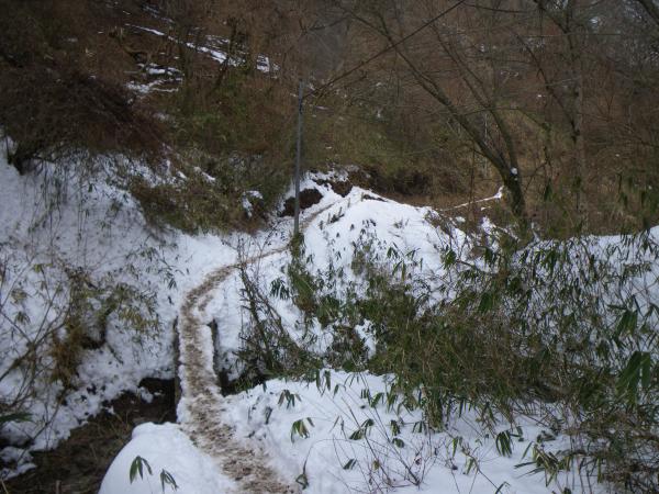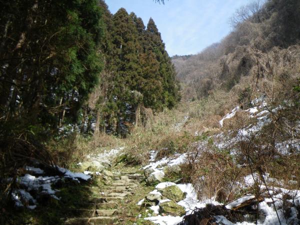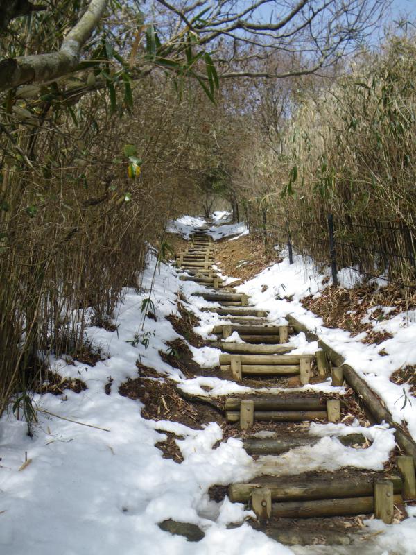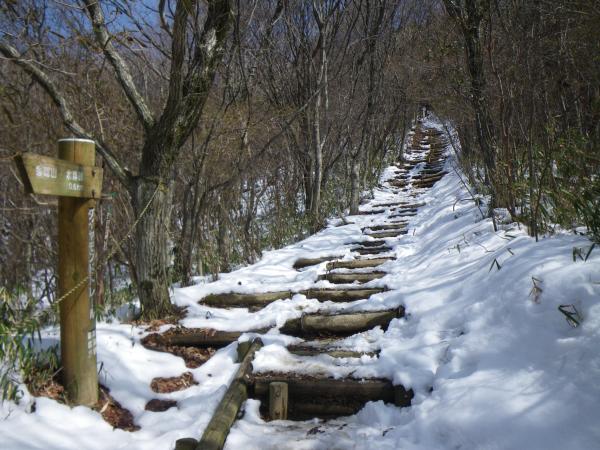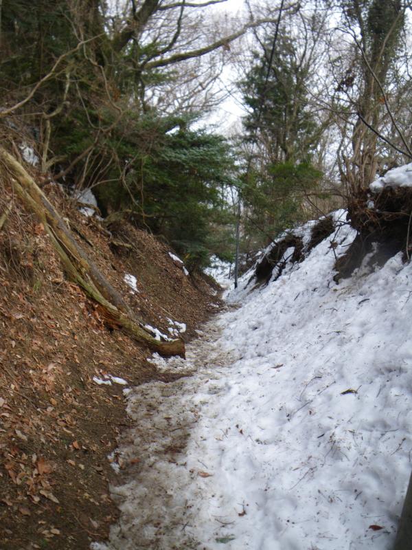 ⑫中盤の石段あたりから雪がでてきますが、あまり凍結していません。下る場合はアイゼンがあったほうが楽です。