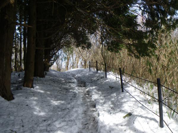 ⑯自然散策路は日当たりが悪いので、雪はたくさんあります。一部凍結でアイゼンが欲しい。