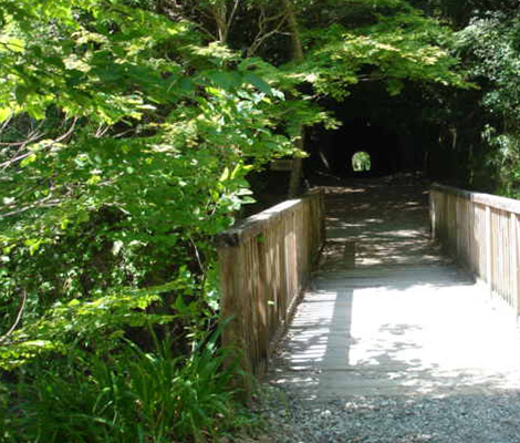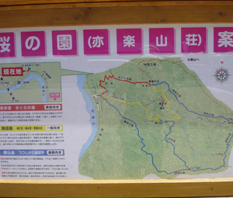 昭和61年に付け替えにより廃線となった旧福知山線の廃線ハイクと桜研究者として有名な笹部新太郎氏を記念して再生された桜の園を通り静かな里山の大峰山を登る里山満喫コースです。