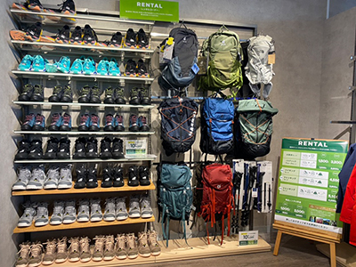 - アミュプラザみやざき・やま館店、青森ラビナ店、ツインモールさくら野北上店、須磨パティオ本店では、登山靴・バックパック・レインウェア・ポールといった、登山の基本装備のレンタルを行っております。 これから登山をはじめようと考えている方、登山初心者の方が、お気軽にレンタル用品でアウトドアを始めるきっかけを サポートし、山のにぎわい創出に繋げます。
