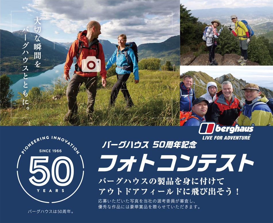 ウェア、シューズ、リュックサック、キャップ等なんでもOK、バーグハウス製品を身につけて
