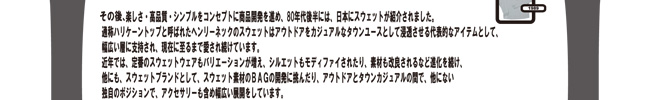 近年ではスウェットブランドとして、スウェット素材のBAG(バック)の開発に挑んだり、アウトドアとカジュアルの間で、他にない独自のポジションで、アクセサリーも含め幅広い展開をしています。