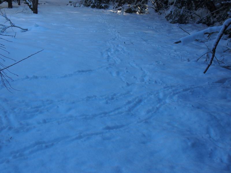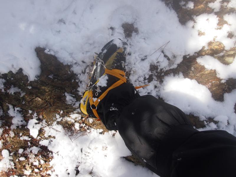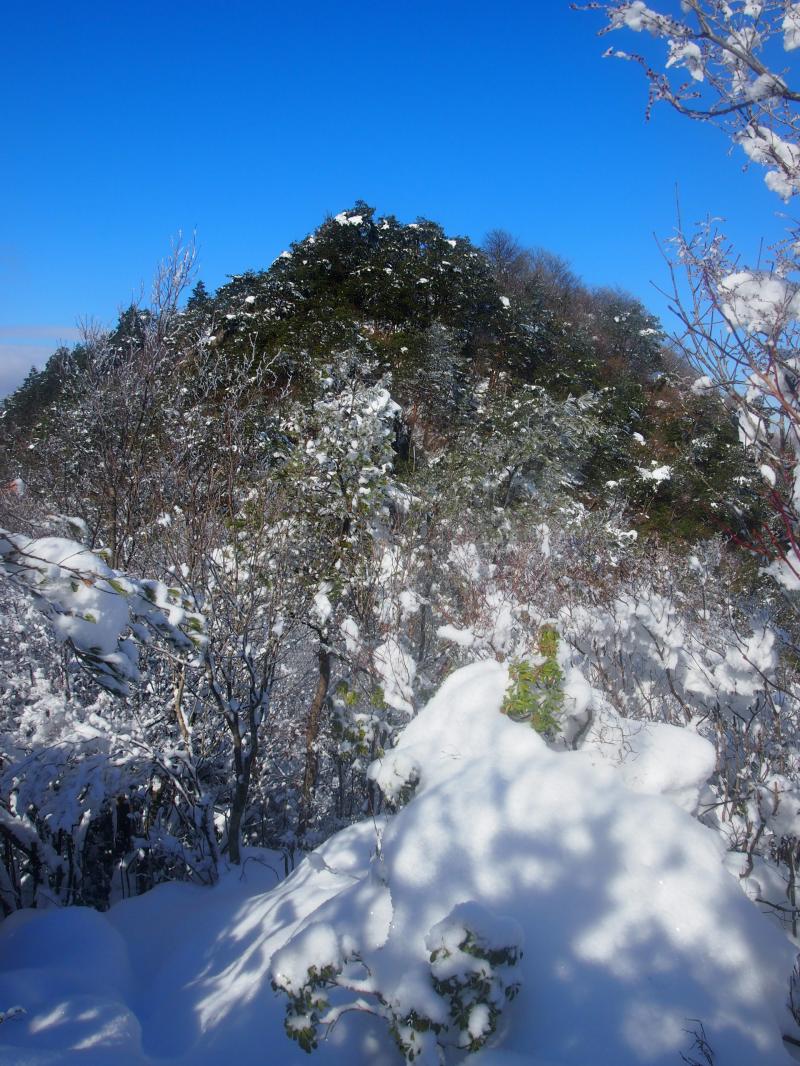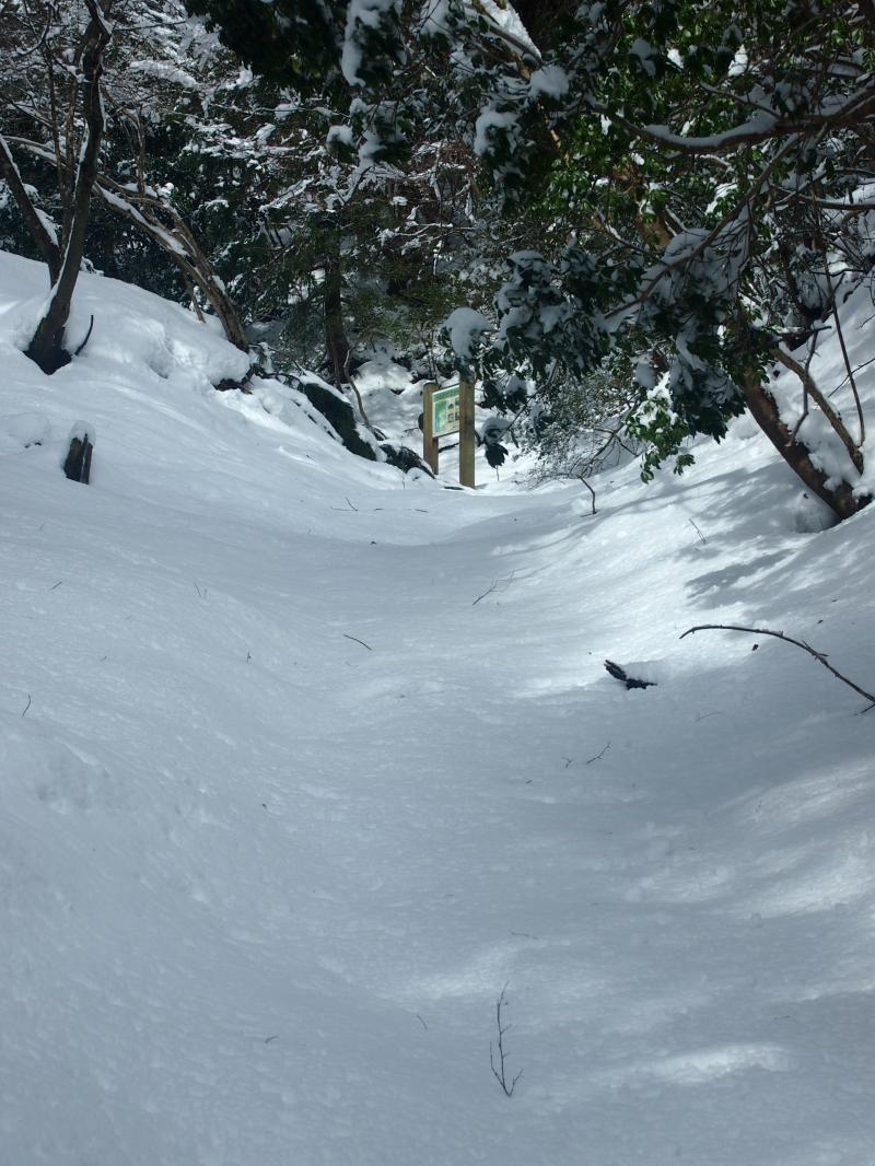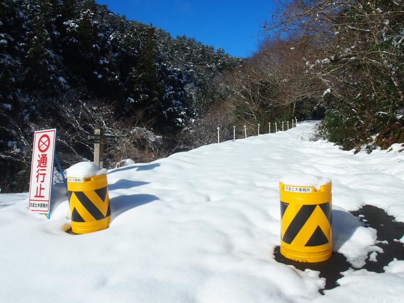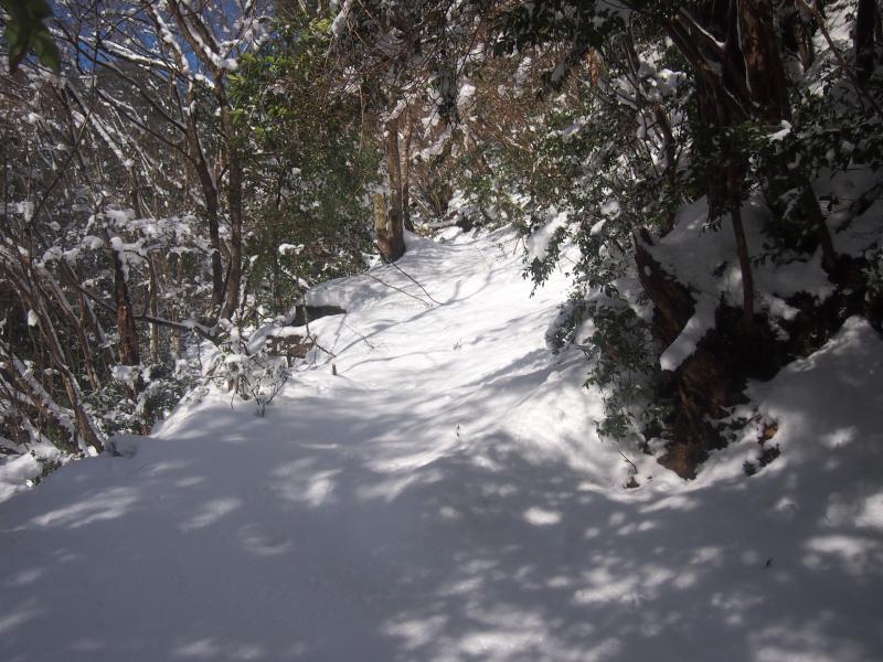 降雪のためアプローチの林道はダム湖畔で通行止めでした。雪の積もった林道をたどっていくのですが、積雪は30~50smほど。他に登る人もなく、一人ラッセル状態。うーん、スノーシュー持ってくるんだった。