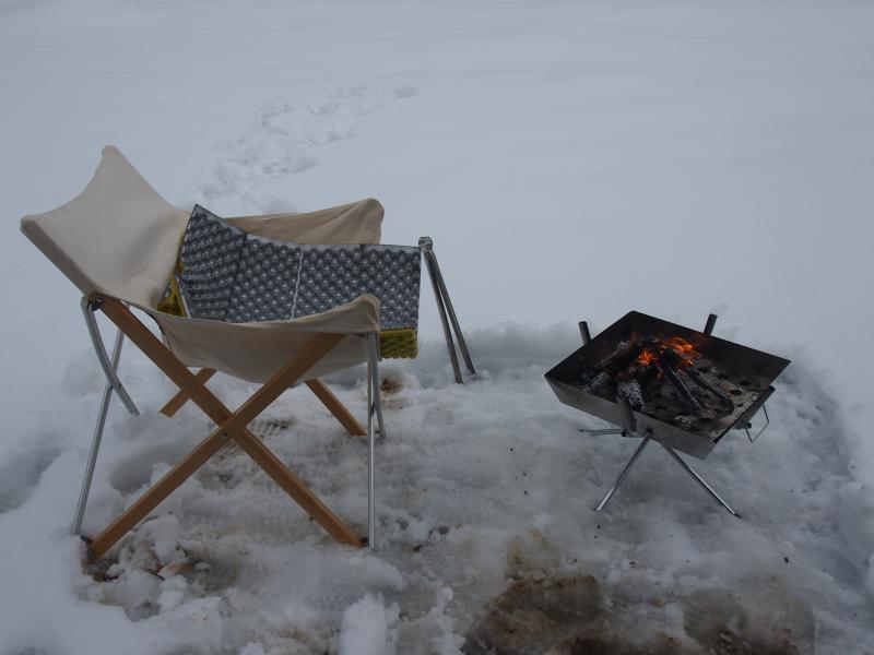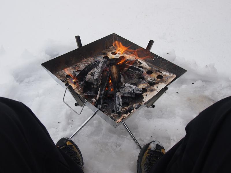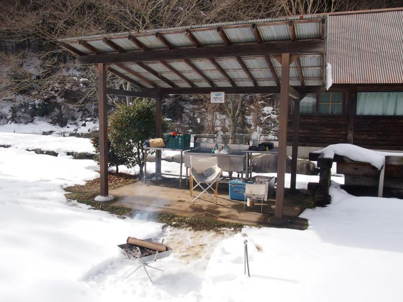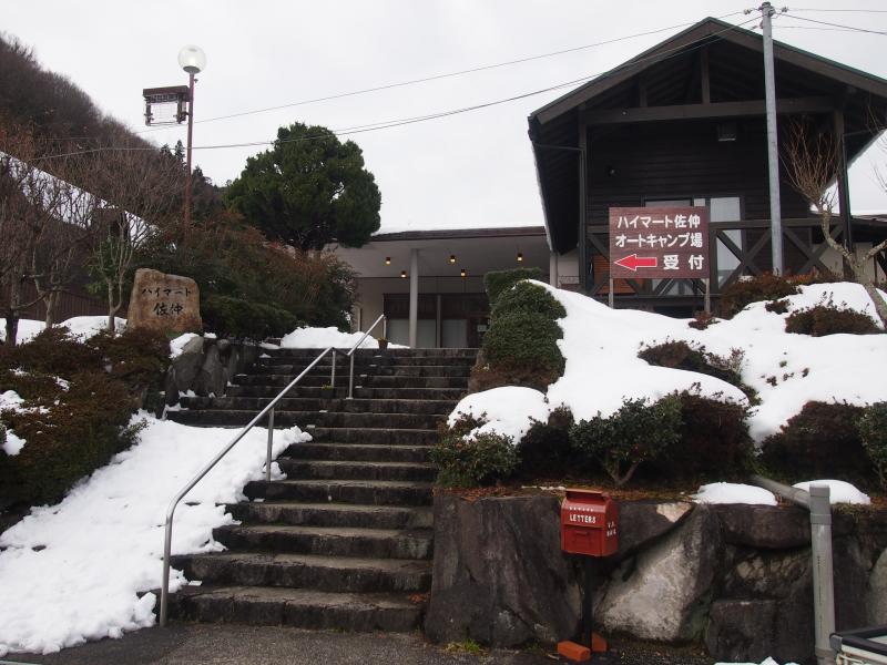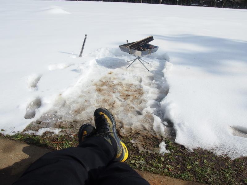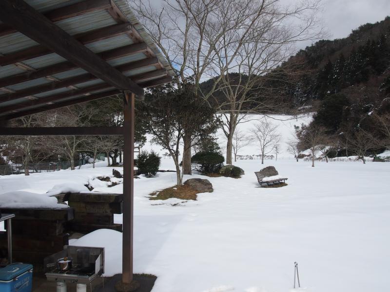 午後からは、ダム下にあるオートキャンプ場ハイマート佐仲でご飯&焚火。ところが雪が多すぎて場内に車の乗り入れができないと・・仕方ないので正面の駐車場から2往復ほどして荷物を運びこみました。場内炊事場の水道も使えないとの事でしたが、水はたっぷり持っていたので問題なし。この日は完全貸切状態でした(まあ、こんな日にわざわざキャンプしに来る人はいないっすよね、ふつー・・)