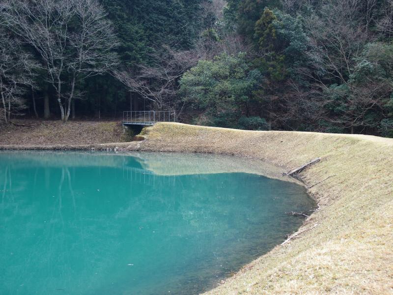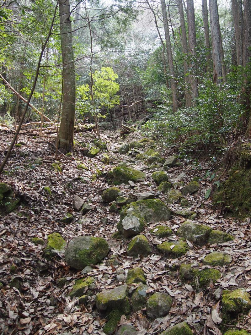 林道をゆったり歩いていくと溜池が3つ出てきます。3つ目の溜池の縁をまわって小さな橋を渡ると登りに入ります。峠までは小さな沢のように石の多い道です。少し荒れ気味ですが、特に危険を感じさせるところはありません。道もわかりにくいという事もないでしょう。