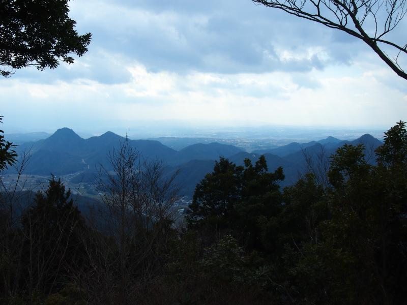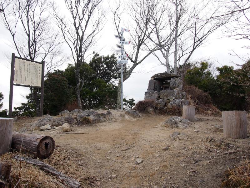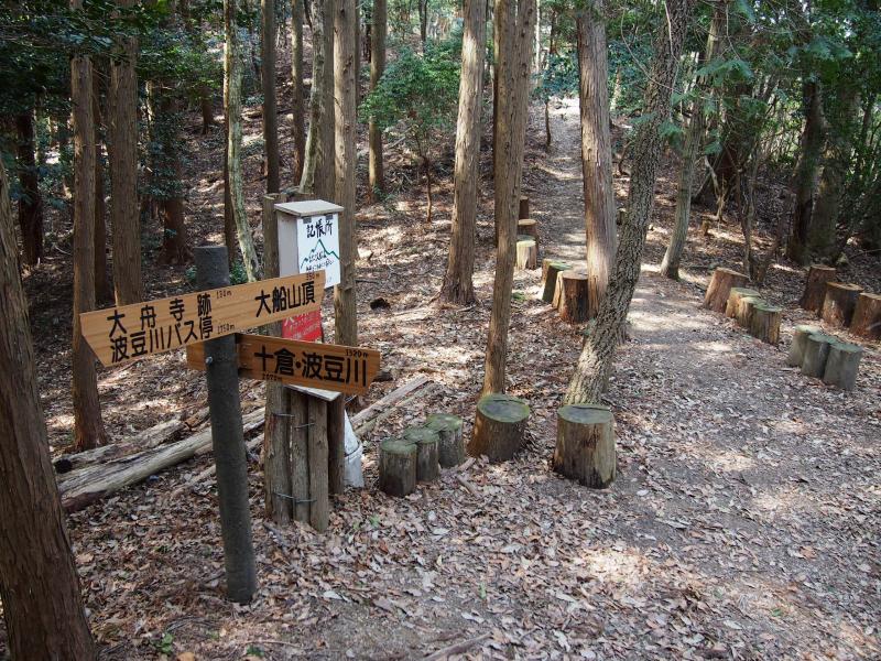 峠で波豆川沿いのカナディアン大磯からの道と合流します。山頂方面に向かうと今度は同じく波豆川の大舟寺方面からの町石道途との分岐点に出ます。ここまでもしっかり登らされるのですが、ここから山頂までが一段と登りがきつくなります。里山やけど、ちょっとしんどいなーと思っていると山頂に出ます。