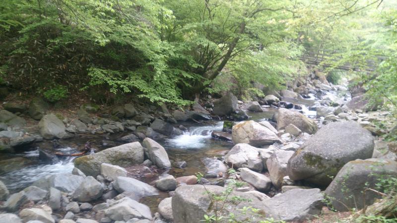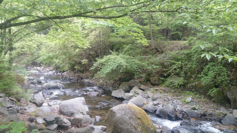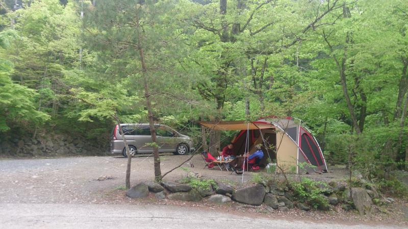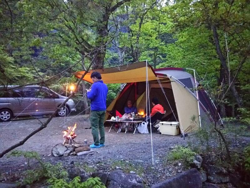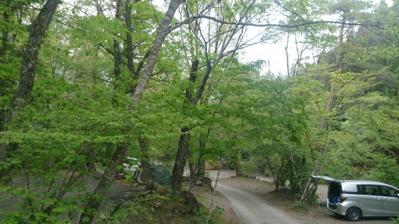 テントサイトの周りは新緑がきれいで、すぐそばには川が流れていて涼しげ。