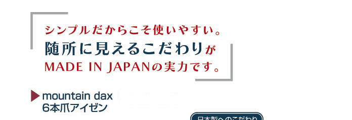 海外製が多い中、全て日本の技術を結集して作られたアイゼン。耐久性に優れているなど、品質へのこだわりが安心感を与えてくれます。
