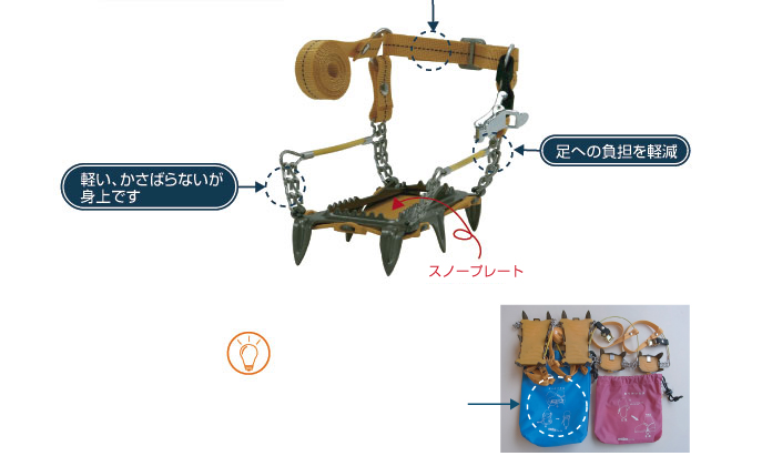軽くてコンパクトな軽アイゼンは、両サイドにワイヤーとチェーンを使用。靴の幅に合わせての調整が不要なので、初心者にはとっても便利!