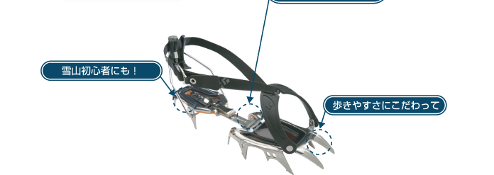 遮雪性、密閉性の高いABS(アンチスノープレート)を標準装備した、スリムなデザイン。スリムなフロントレイルと相まってブーツにぴったりとフィットするので、アイゼン歩行に慣れていない雪山初心者にもオススメ!