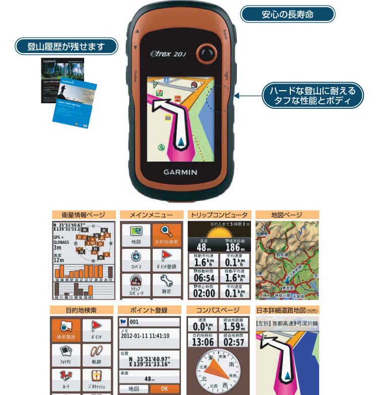 2.2インチのディスプレイ、65000色カラー。アウトドアで性能を発揮する視認性の高い半透過型と高性能でいて、防水性と軽くてタフなボディを兼ね備えています。