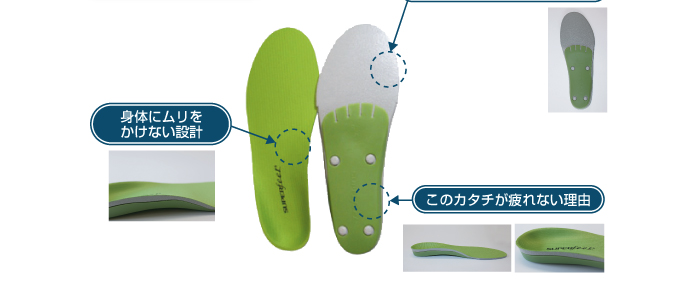 土踏まずが扁平にならない状態にしてくれるので、自然な歩行を実現。安定した足の骨格を作り出すので、身体への負担を軽減してくれます。