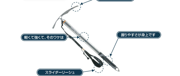 凍結した雪面にも対応できる、打ち込みやすいピックと絞り込まれたヘッドで、雪山での歩行を助けてくれる頼りになるピッケルです。