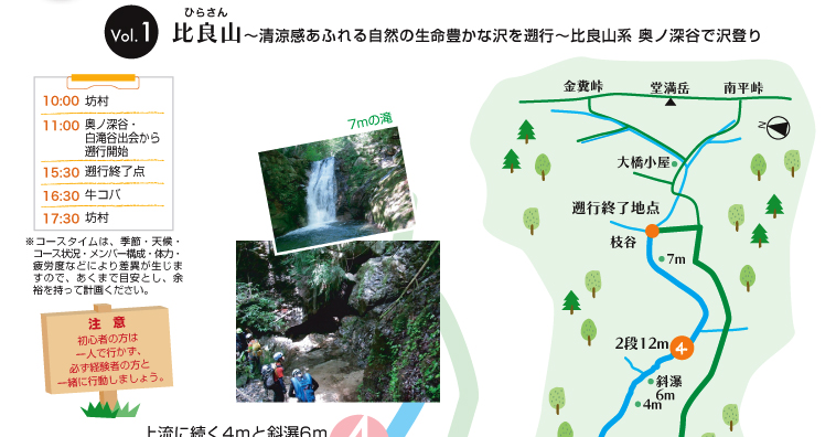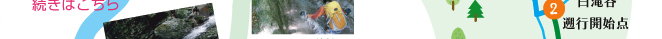 ここは安全のためにロープを使います。手をケガと冷えから守るグローブも大活躍です。何ヶ所かは懸垂下降の場面もあり、美しさに見とれている場合ではなくなってきました。いよいよ佳境です!足場をしっかり見定めて、終了点近くの7mの滝へ向かいます。遡行終了点まであとひと息!ゆるやかなカーブを過ぎてしばらく進むと美しい7mの滝が姿を現しました。