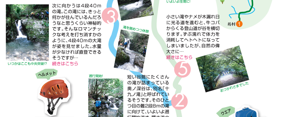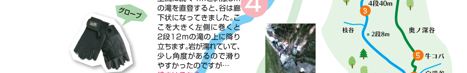 上流に続く4mと斜瀑6mの滝を直登すると、谷は廊下状になってきました。ここを大きく左側に巻くと2段12mの滝の上に降り立ちます。岩が濡れていて、少し角度があるので滑りやすかったのですが、靴底のフエルトの威力を感じることができました。さすが!なかなかのスグレモノです!