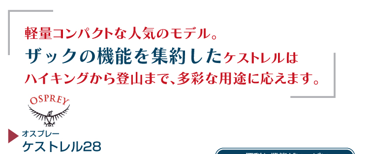 体型に合わせて調節できるベルトや、腰骨がすっぽり包まれるウエストベルト、そしてストックが不要になる岩場で活躍するループホルダーや、急な雨に役立つザックカバーなど、うれしい機能が多彩に。