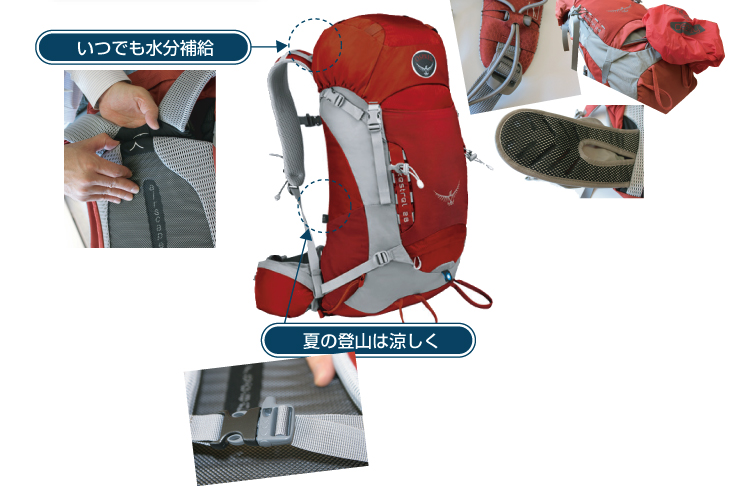 エアスケープバックパネルが、背中に空気の通り道をつくってくれます。汗をかいてムレやすい夏山登山には必携です。